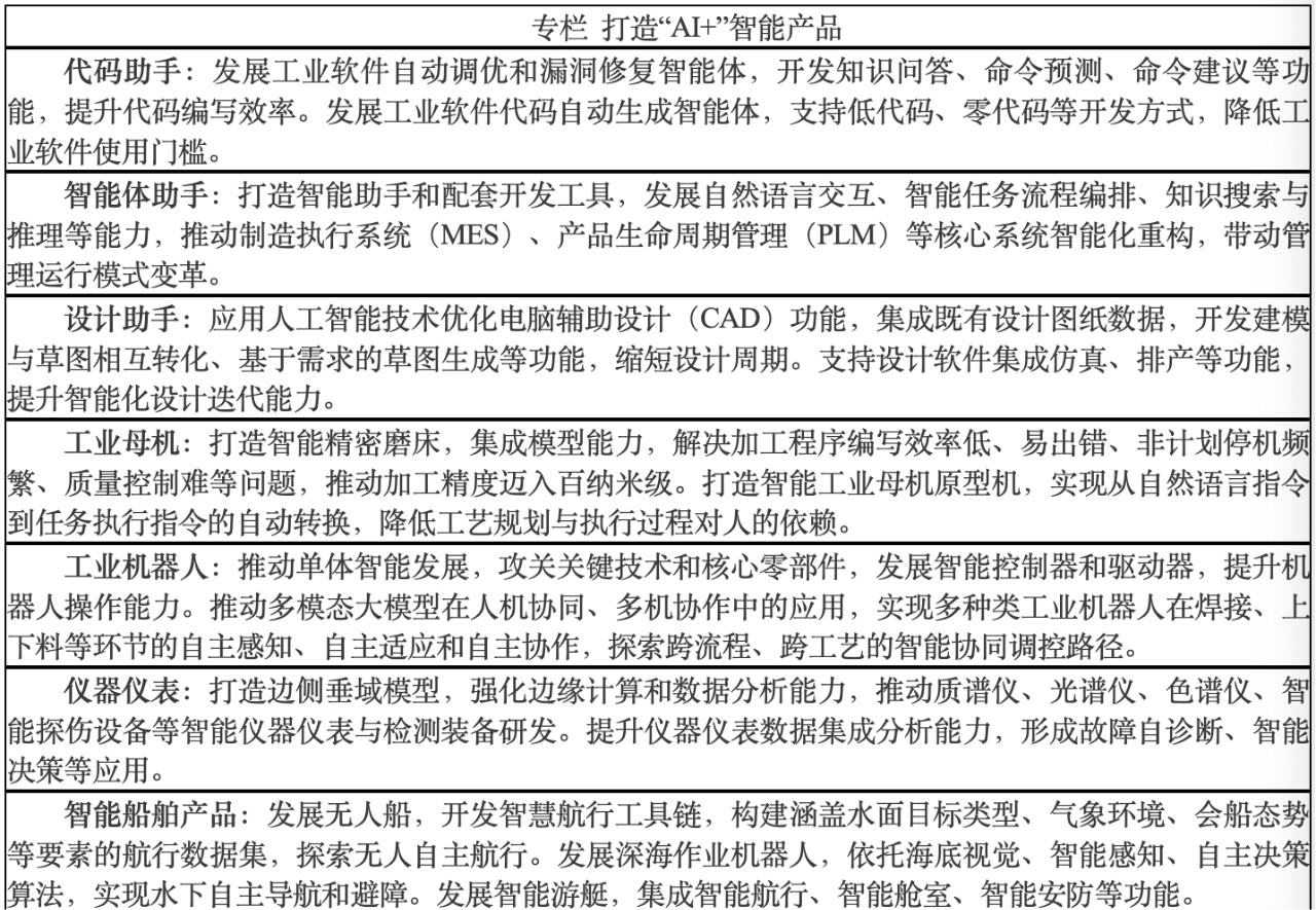 推動(dòng)工業(yè)母機(jī)、工業(yè)機(jī)器人、儀器儀表、能源裝備、醫(yī)療設(shè)備、船舶以及低空等工業(yè)產(chǎn)品和裝備融合應(yīng)用人工智能技術(shù),實(shí)現(xiàn)智能化升級(jí)與功能拓展,全面提升感知、交互、控制、協(xié)作與自主決策水平。聚焦大模型與邊緣智能應(yīng)用,增強(qiáng)裝備系統(tǒng)的適應(yīng)性、靈活性和運(yùn)行效率。支持優(yōu)質(zhì)企業(yè)基于現(xiàn)有工業(yè)產(chǎn)品和裝備,打造智能產(chǎn)品矩陣。