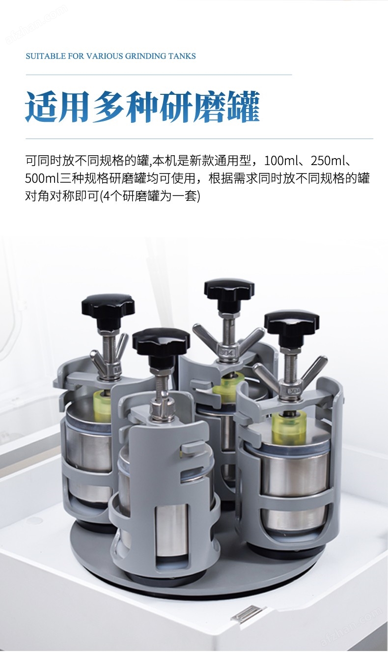 1.適用研磨罐:本機(jī)是新款通用型,100ml、250ml三種規(guī)格研磨罐均可使用,可根據(jù)客戶需求使用不同規(guī)格材質(zhì)的研磨罐;對(duì)角對(duì)稱即可(4個(gè)研磨罐為一套)。
