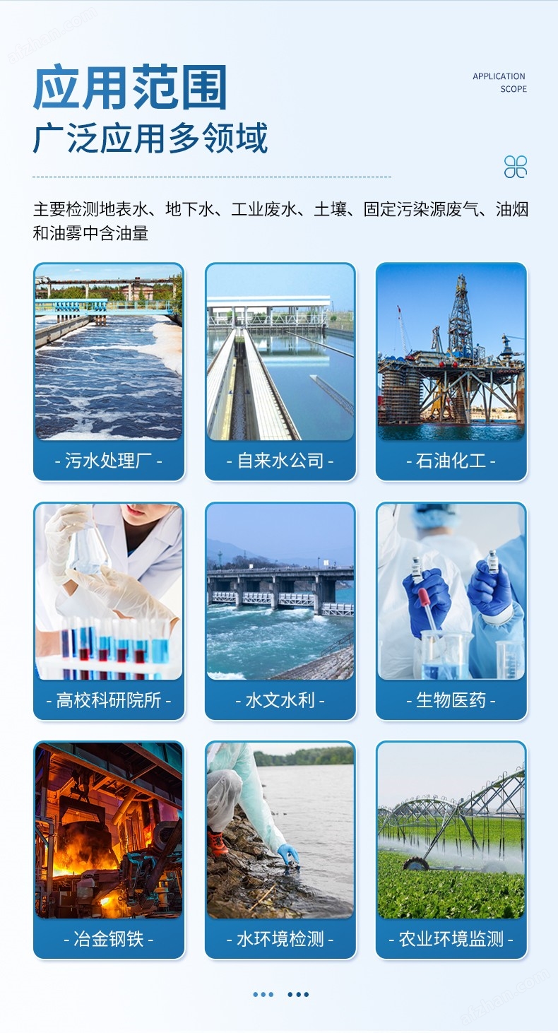 可用于:地表水、地下水、生活污水、工業(yè)廢水、土壤中的礦物油和動(dòng)植物油及廢氣中油煙和油霧的排放檢測(cè);